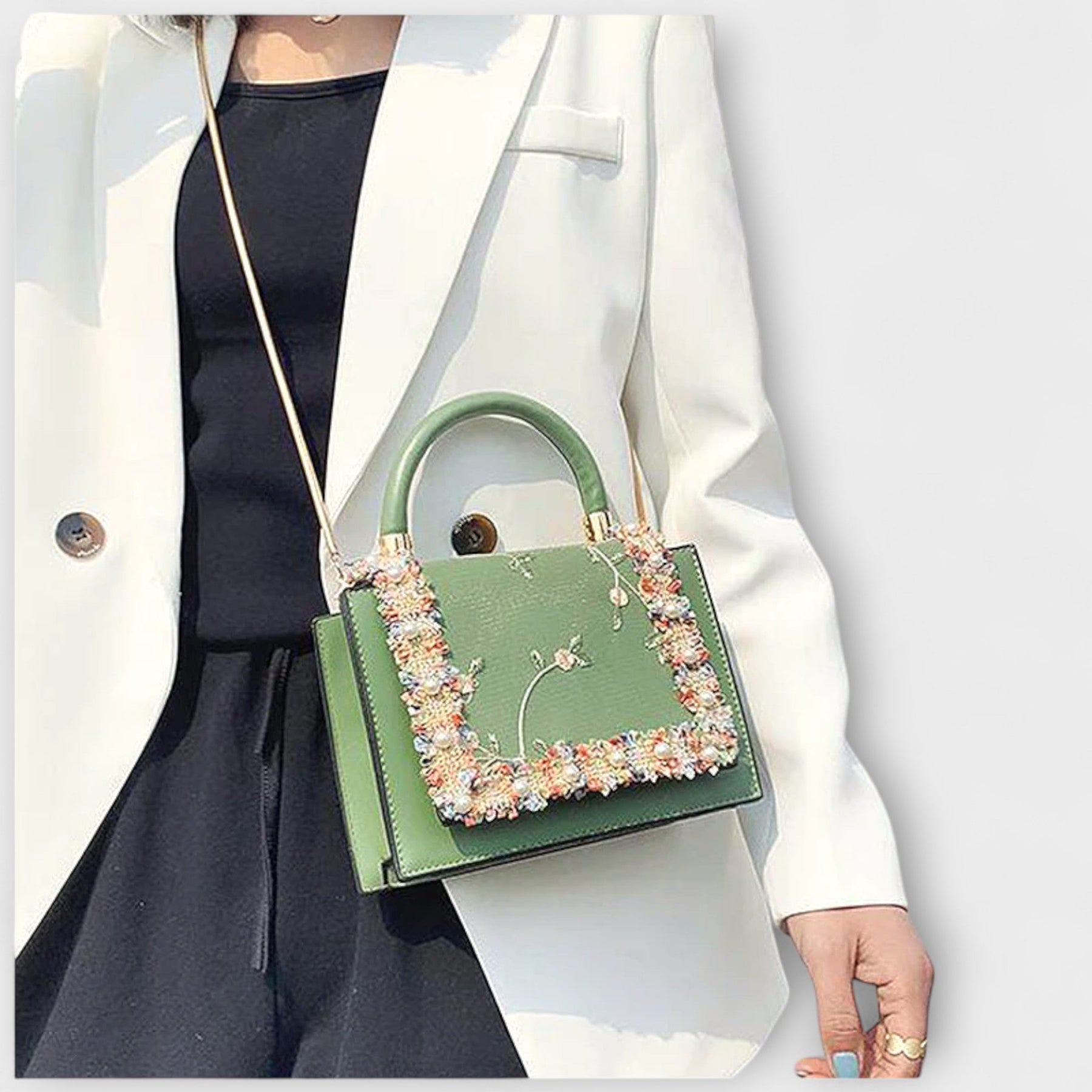Maestromente confeccionado con el más fino cuero vegano, este bolso es más que un accesorio: es una pieza de declaración estilosa y funcional que completa tu atuendo de manera elegante y destaca por detalles refinados como encaje y perlas.