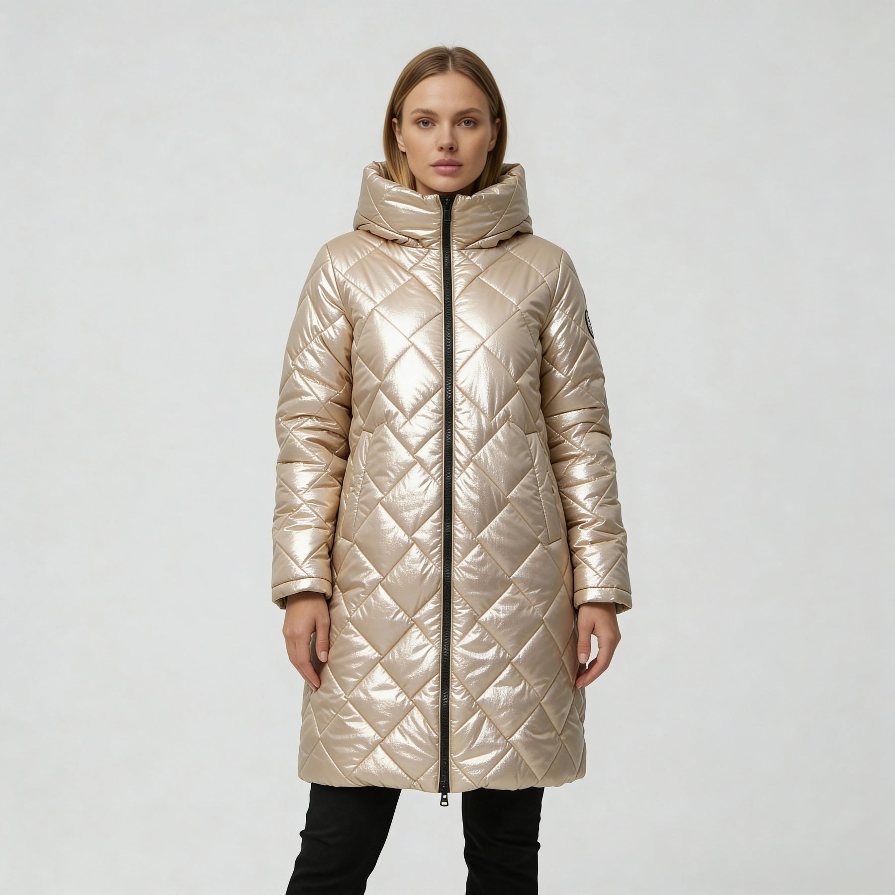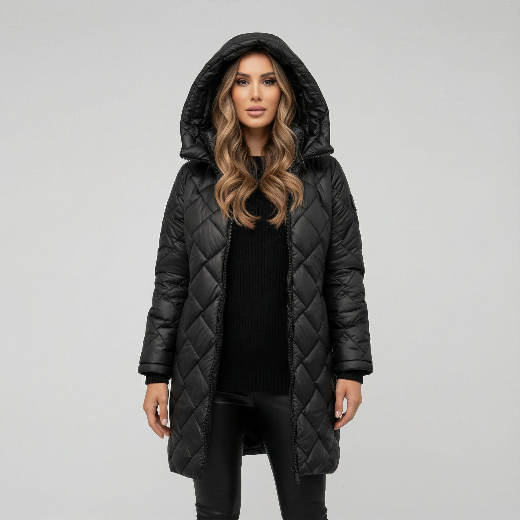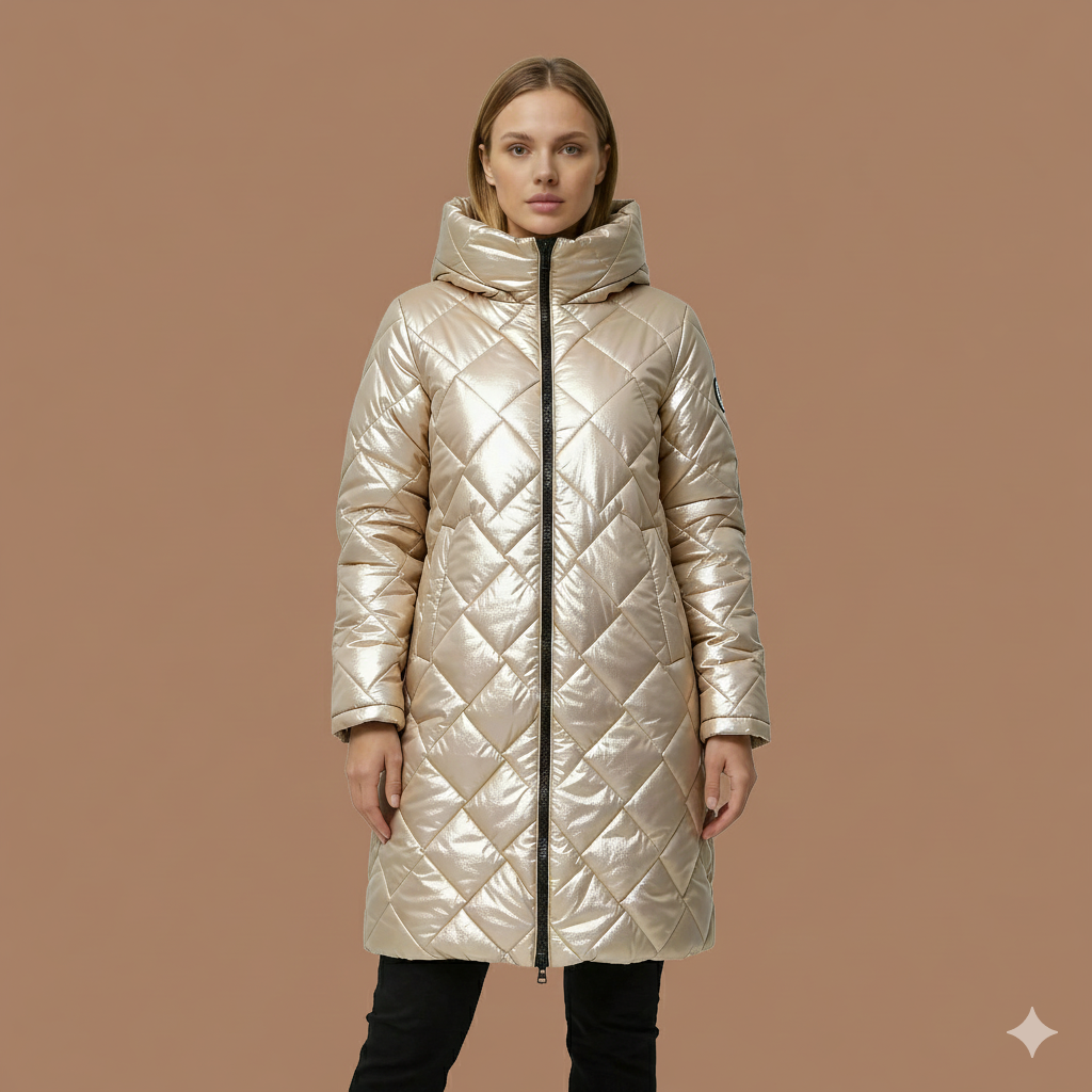 El diseño presenta un patrón de acolchado en forma de rombos que aporta textura y un efecto visual estilizado. Su capucha amplia enmarca el rostro con armonía, brindando mayor calidez sin añadir volumen innecesario. Cada costura está pensada para equilibrar movilidad y elegancia, logrando un abrigo que no solo protege, sino que realza tu presencia con un toque moderno y minimalista.